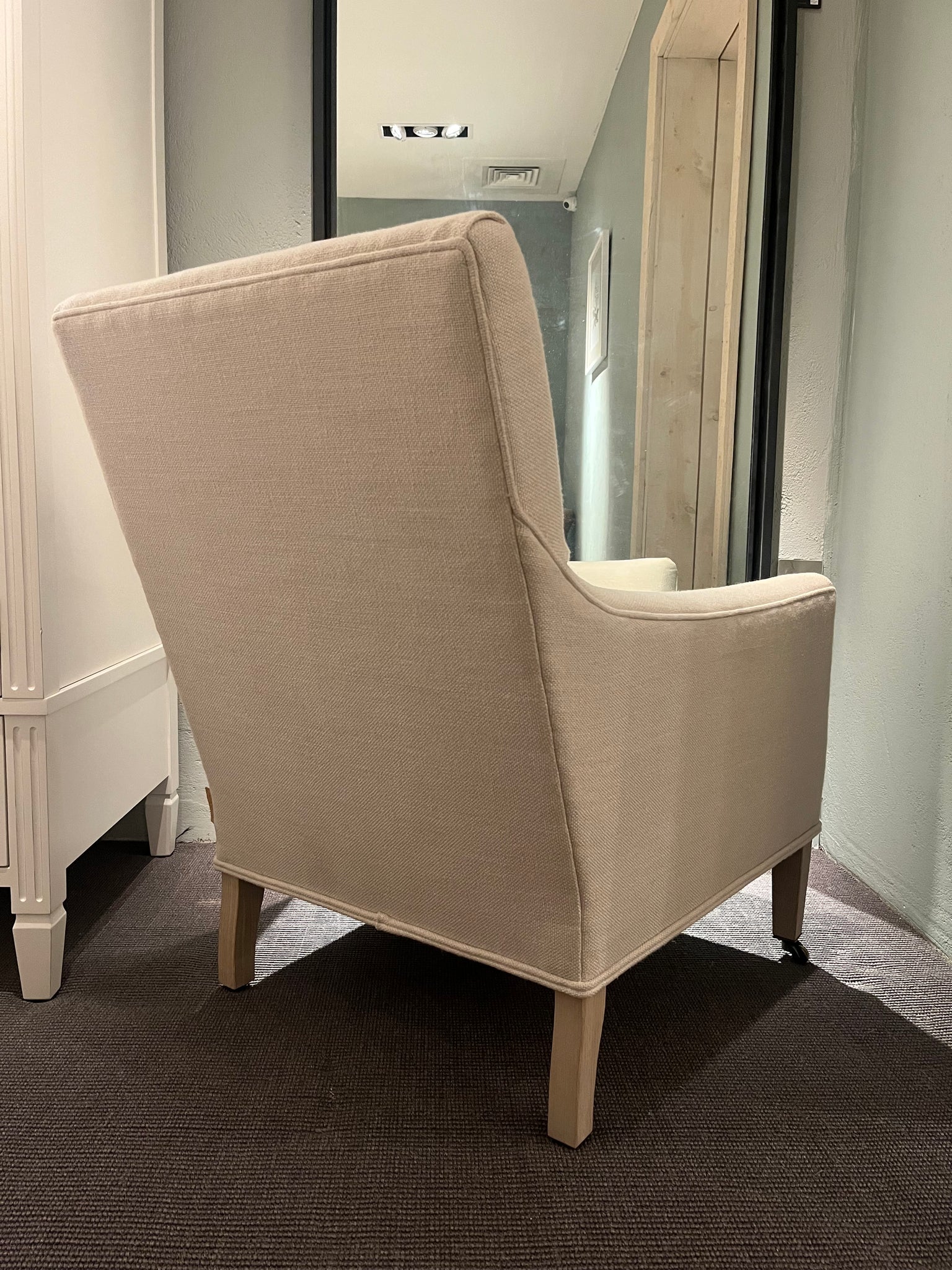 This armchair is destined to become a future heirloom, referencing classic British upholstery through its deep seat and sloping armrests. Theo’s snug proportions are designed for comfort and support, with a subtly reclined backrest and deep, removeable seat cushion. Resting on tapering oak legs with brass castors and hand-upholstered in your choice of fabric.