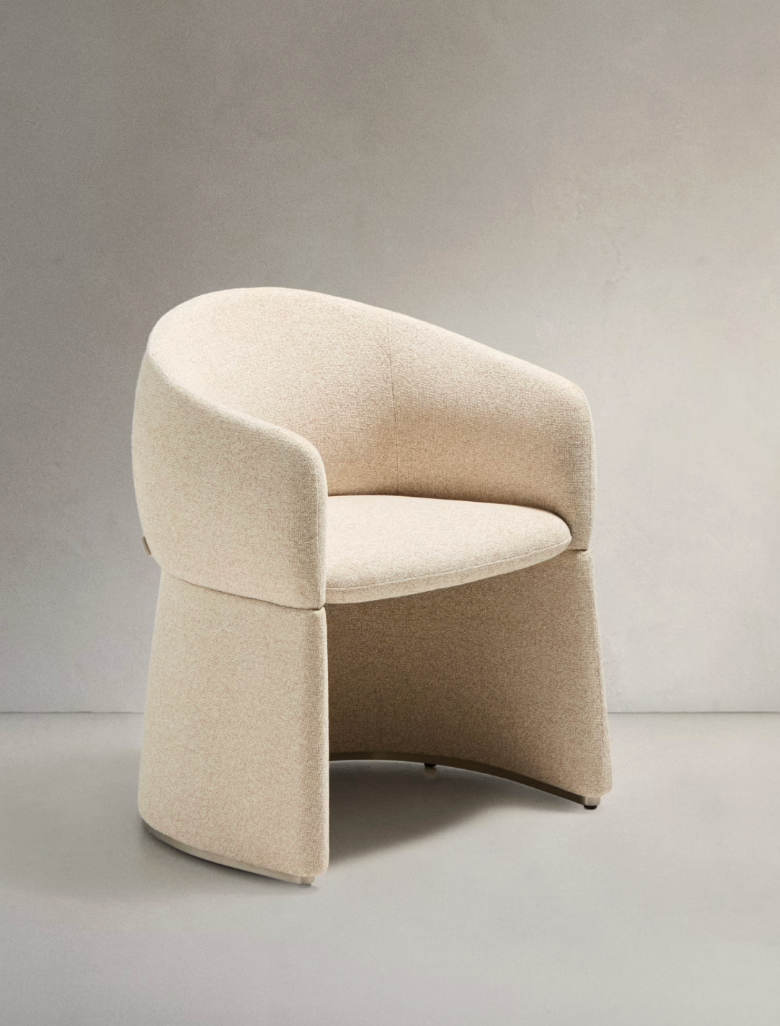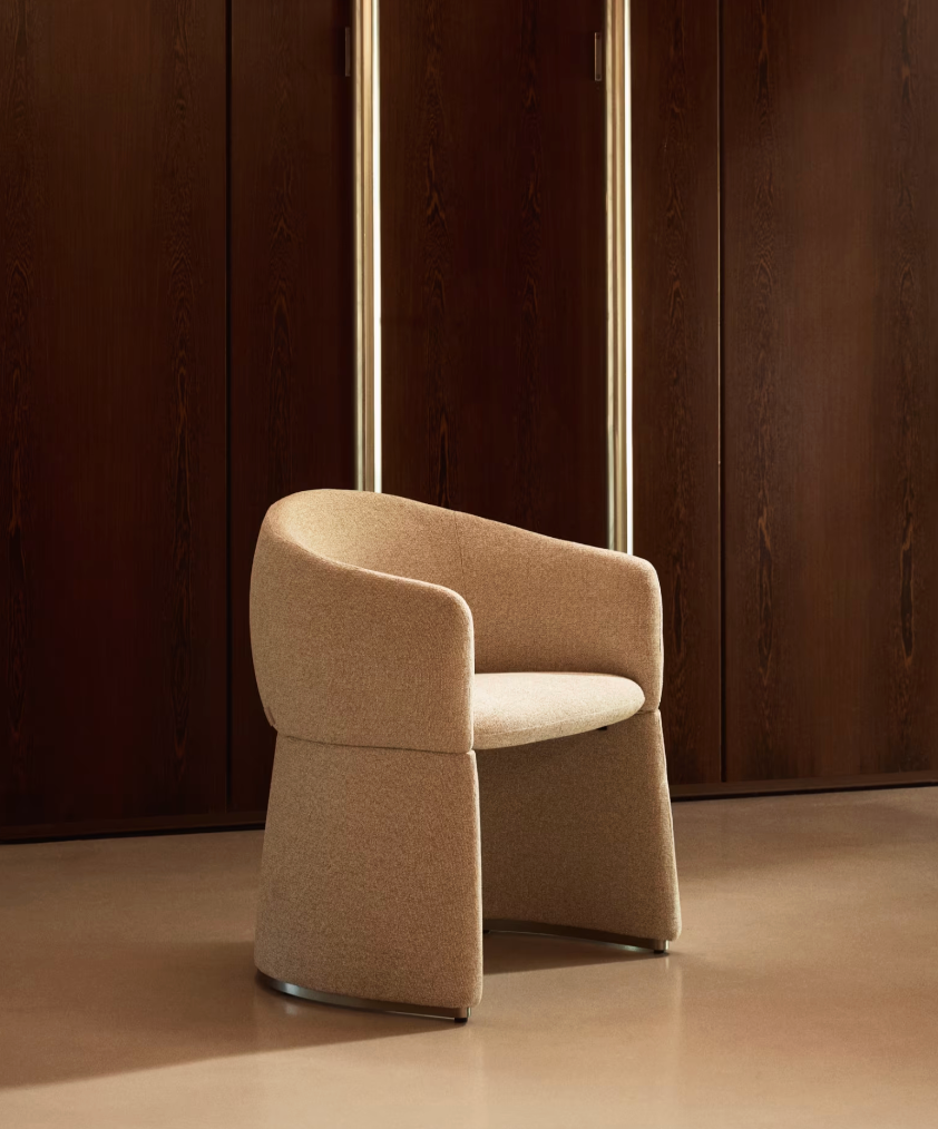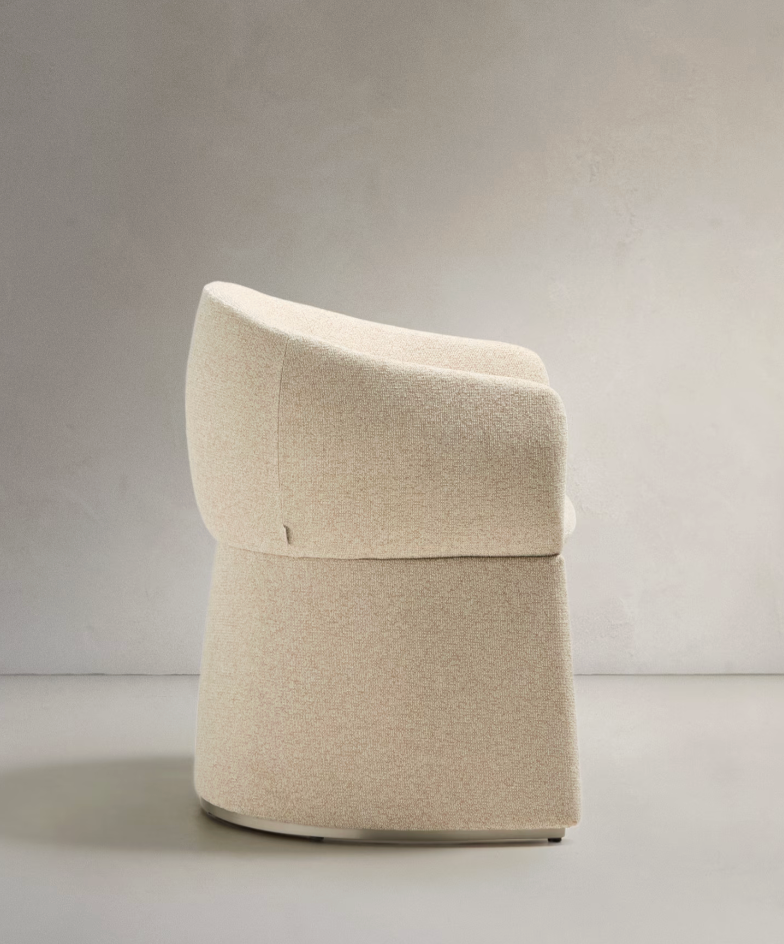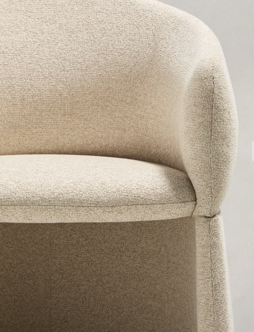 This chair stands out for its sculptural design, where generous, enveloping shapes are balanced by a subtle, refined silhouette. The wide, welcoming seat rests on an upholstered plywood base with a metal perimeter frame to protect the fabric.