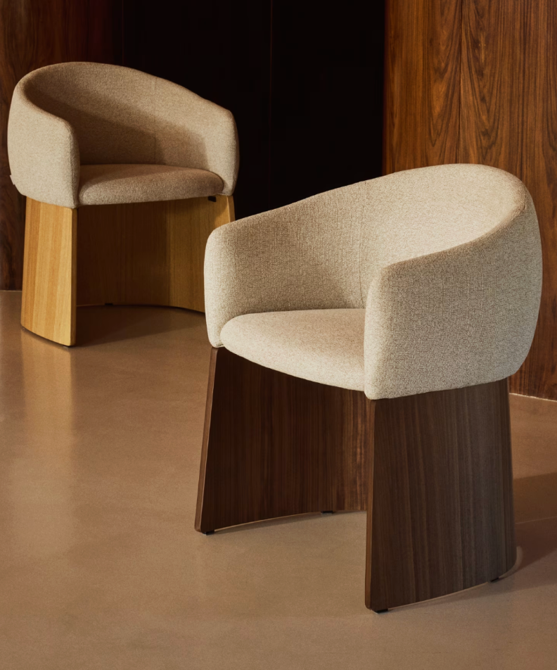 This chair stands out for its sculptural design, where generous, enveloping shapes are balanced by a subtle, refined silhouette. The wide, welcoming seat rests on an upholstered plywood base with a metal perimeter frame to protect the fabric.