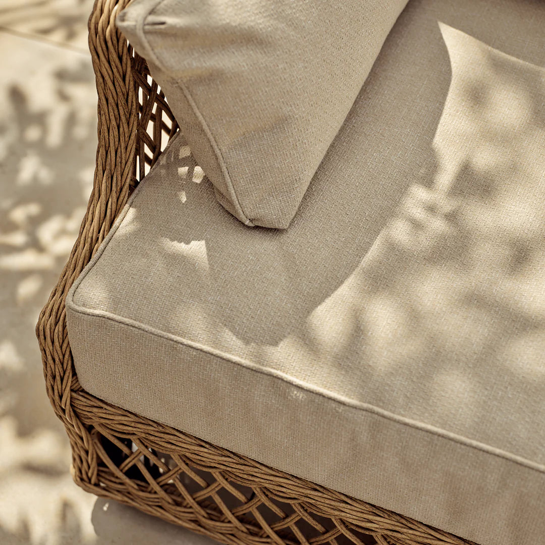 Longmeadow is our contemporary take on the classic wicker garden style. Handwoven from our durable all-weather wicker, its minimal lattice design lets sunlight shine through and is finished in a warm honey-colour. With weather-resistant cushions in a textured woven fabric, this generously sized armchair makes for a deeply relaxing seat.