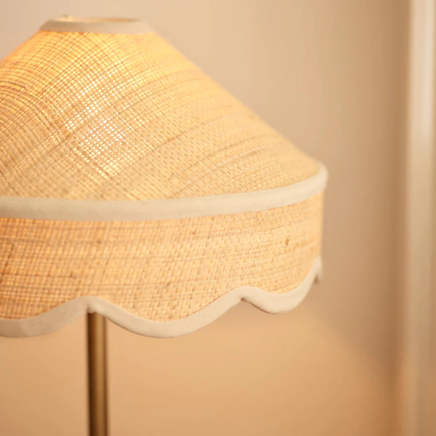 Marina marries feminine scalloped shapes with the natural texture of raffia. This petite table lamp has a neat, tailored finish and is complemented by its understated antique brass stepped base. Use it in pairs on bedside tables, or as an accent lamp on a kitchen counter, or dresser to add a touch of femininity.