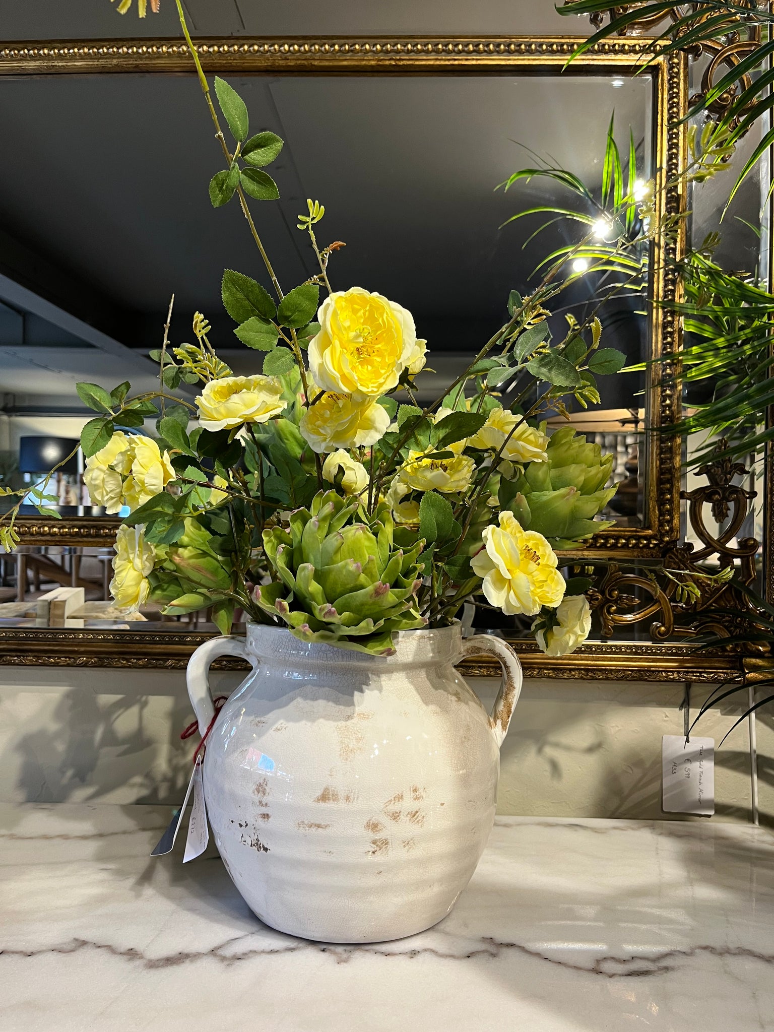 A fresh, sun-kissed bouquet featuring soft yellow roses and lush green artichokes, arranged with the natural foliage of the roses in our rustic white Haybrook ceramic vase.